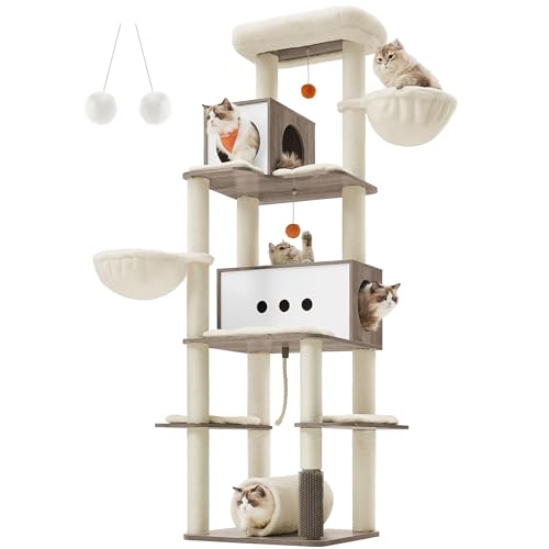 Feandrea stort kattträd, 197 cm högt, XXL kattträd, modernt katthus i flera våningar med 2 grottor, 2 solstolar, 4 skrapstolpar, kattborste, tunnel, plattformar, Greige PCT193G01