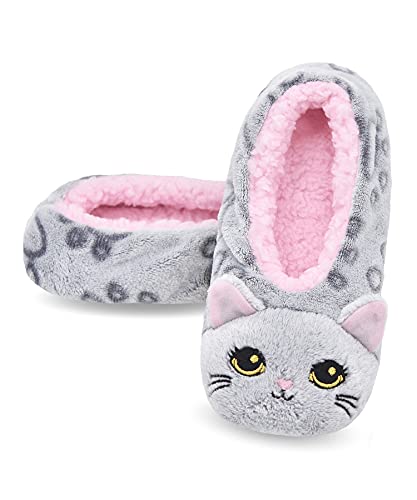 Panda Bros toffelstrumpor med halkfria greppare, söta luddiga varma kattdjur hustofflor, Grå tass katt, 8-10