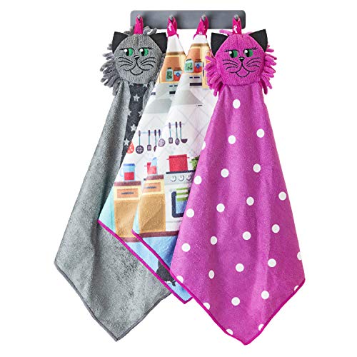 Vigar Felix 5-pack krokar och handdukar, 4 x mikrofiberdukar, 1 x 3M självhäftande krok med fyra klor, superabsorberande handdukar med accenter av kattdjur, grå och rosa