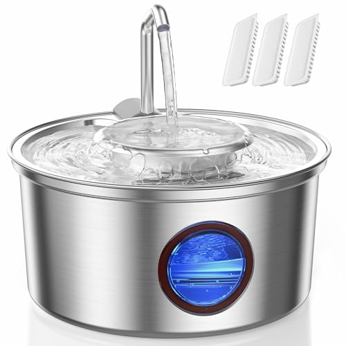 PLOOHT Dricksfontän för katt, stor kattfontän i rostfritt stål 3,0 l, metallvattendispenser med 2 pipar, 1 silikonpump och 2 filter, perfekt för katter, små hundar (adapter ingår)