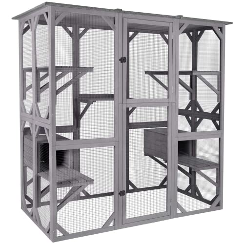 PawHut Katthus utomhus kattgrotta av trä, med hopfällbart asfalttak, väderbeständig kattkoja med fönster, 3 dörrar, 77 x 57,5 x 68 cm, grå