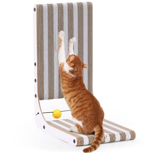 FUKUMARU Kattklo, 68 cm L-formad Kattklopadda, Randig Kattklopel Väggmonterad, Kartong Kattklosats med Bollleksak för Innekatt, Inklusive Rolig Låda