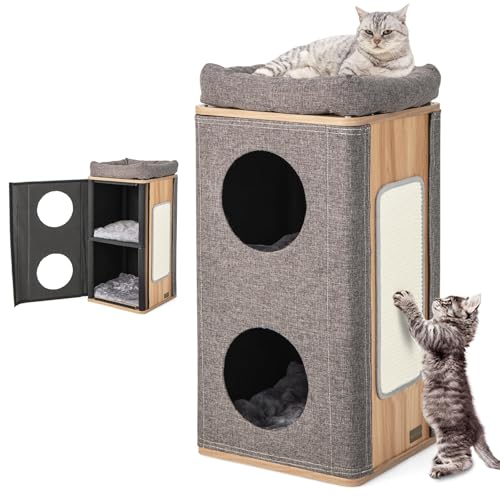 COSTWAY Klösbräda med kattskåp, allt-i-ett-kattkoja i trä, klösbräda med ingång, grotta, sisalstam & lekboll, kattmöbel katträd, kattlekstuga, 77,5x49x132 cm, grå