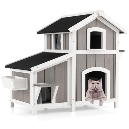 COSTWAY Katthus för utomhusbruk, kattkoja i 2 våningar, kattvilla med asfalttak, flyktdörrar, PVC-ridåer, ingång & blomlåda, upp till 30 kg, väderbeständig för utomhusbruk, grå, 100 x 64 x 82,5 cm