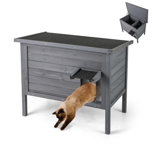 COSTWAY Katthus utomhus vinterfest, kattkoja för vinter, trä, kattgrotta med skumisolering och tak, PVC-dörr och skiljevägg, för utomhusbruk, inomhus, 88 x 55 x 69 cm (grå)