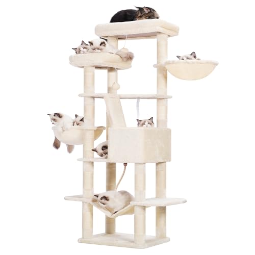 Heybly Katträd 68 Tums Kattorn Med Flera Nivåer För Inomhuskatter 2 Breddade Plyschpinnar Kattkoja Med Skraplåda, Beige HCT025M