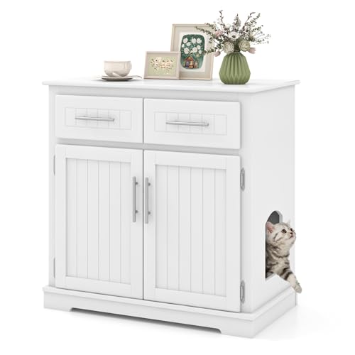 COSTWAY Kattskåp för kattlåda, kattlådsskåp med 2 lådor, 2 dörrar & ingång, sidobord för kattkoja, kattmöbler för inomhusbruk, modern, 80 x 45 x 80 cm, vit