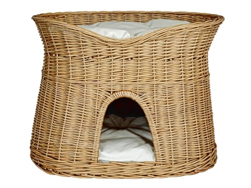 e-wicker24 Alles aus Weide Oval kattkoja i naturlig färg, pilkorg, korg för katt med två våningar, kattförvaring med kudde, katttorn
