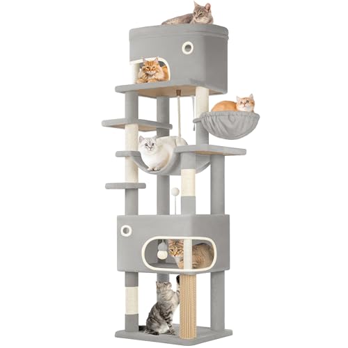 Hzuaneri kattträd, 203 cm flerskiktad klösträd med stor plattform, 2 grottor, 7 skrapstolpar, pompoms, kattkorg, hängmatta, lämplig för katter i alla storlekar, Ljusgrå MS20318LG