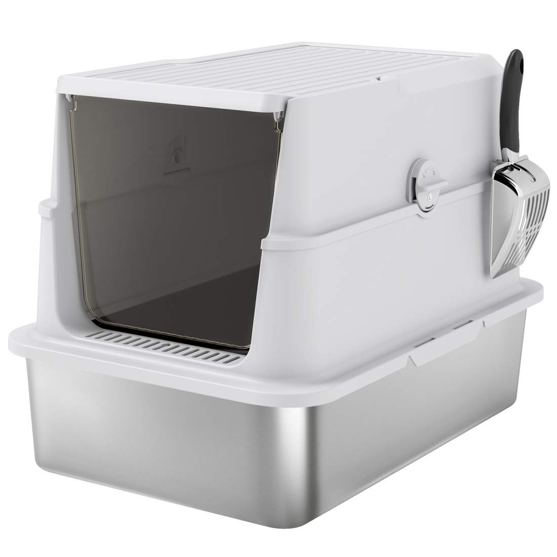 Euakee Sandlåda lock i rostfritt stål med extra stor kattlåda i metall XL för stora katter, hög ansiktsdesign med sked och pedal, läckagesäker, lätt att rengöra (B)