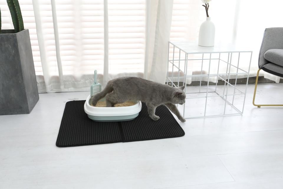 Conlun matta kattsandsmatta 89 x 58 cm kattlådematta, rutnät strökontroll design kattlådeunderlägg, vattentätt urinbeständigt material, lätt att rengöra (svart)