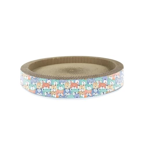 Rund kartong klösstolpe med kattmynta – mått: Diameter 40 x 6 H cm – cylindrisk form – leksak för katter och bekväm kennel – havannafärg med mönster