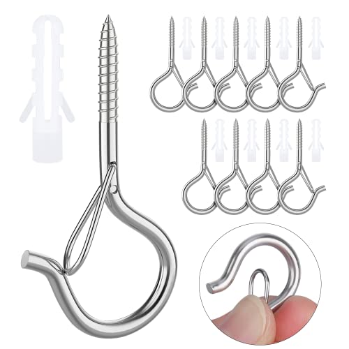 MOGADEE® Skruvkrok rostfritt stål 10 stycken, krok för skruvning, takkrok tung last, med säkring, krokskruvar för upphängning växtkorgar juldekoration kattnät