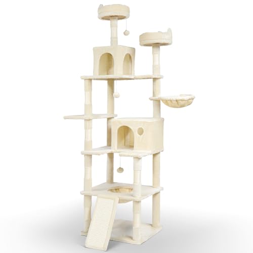 VOUNOT Jätte katträd med klätterträd för katter aktivitetscenter med 2 nischer och 3 kattplattformar, tillbehör ingår, höjd 215 cm, beige