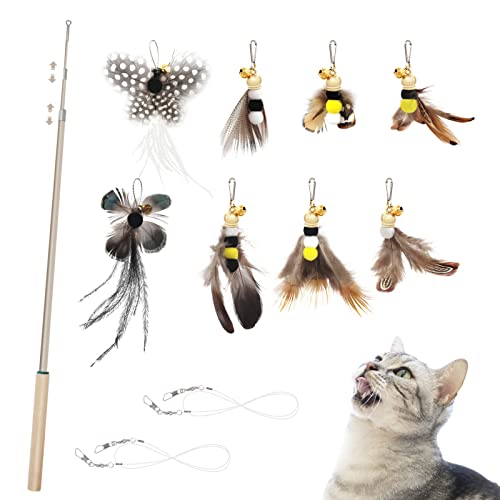 SONGWAY Kattfjäderpinne leksak – 9 st insektsformade kattfjäderleksaksset, 1 infällbar kattstav och 8 fjäderpåfyllningar med klockor, interaktiv kattleksak för inomhus katt kattunge träning lek