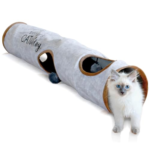 KaraLuna Premium kattunnel, 120 x 24 cm, 3 kickhål och lekbollar, katter, lektunnel, vikbar kattleksak, katttunnel, skalltunnel, grottrulle, katttunnel, katt, grå kanin XXL
