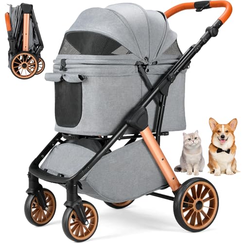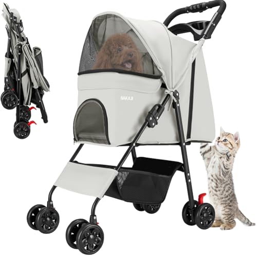 BAKAJI Husdjursvagn, maximal belastning 30 kg, hopfällbar och platsbesparande hund- och kattvagn med förvaringskorg och låsbara hjul, UV-skyddande kappa (grå)