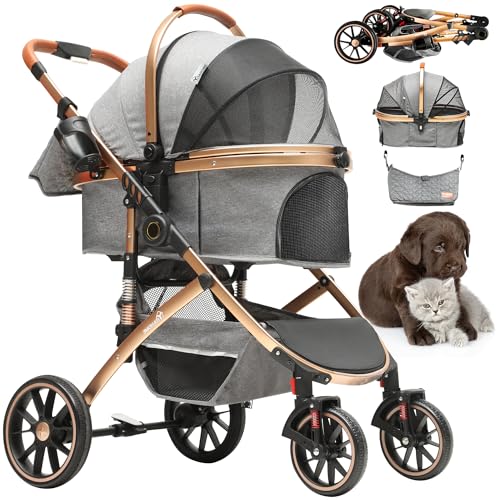 YITAHOME 3-i-1 hundvagn med dragkedja, lös uppgradering aluminium hundvagn för med universella stötdämpande framhjul, vikbar kattvagn med mugghållare och broms (grå)