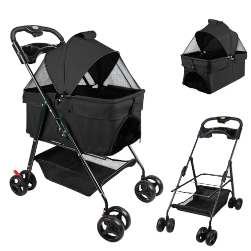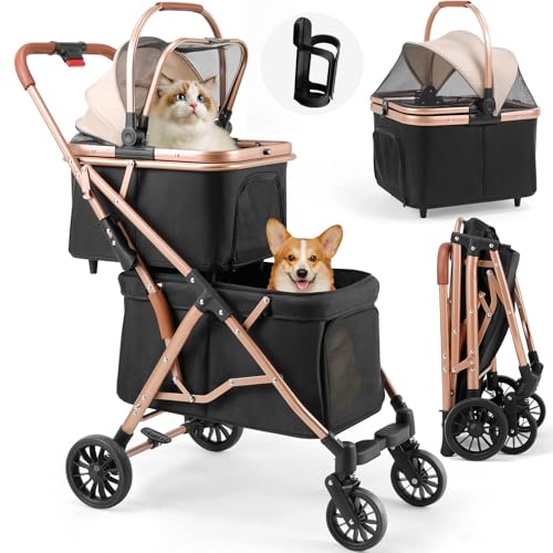 MAMIZO 4-i-1 vikbar hundvagn, 2 våningar, husdjur buggy upp till 15 kg, kattvagn för 2 hundar/katter, 4 st slitstarka PU-hjul, hundbur, transportväska, svart