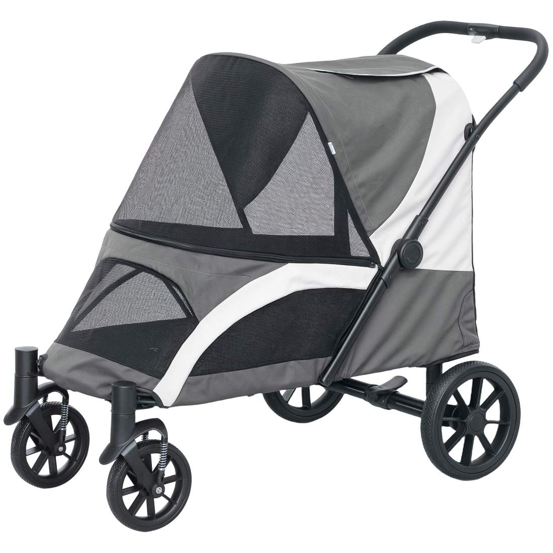 PawHut hundvagn hundvagn vikbar för hundar och katter upp till 20 kg kattvagn med terränggående gummihjul kudde nätfönster dörrar kattvagn med förvaringskorg buggy grå