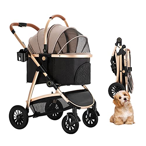 Hundvagn 3-i-1 hundvagn, hundbur, transportväska, vikbar kattvagn, upp till 20 kg, 360° slitstarka gummihjul, med förvaringskorg, nätfönster mugghållare, för små hundar och katter (champagne)
