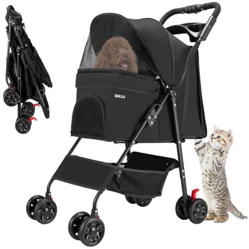 BAKAJI Husdjursvagn, maximal belastning 30 kg, hopfällbar och platsbesparande hund- och kattvagn med förvaringskorg och låsbara hjul, UV-skyddande kappa (svart)