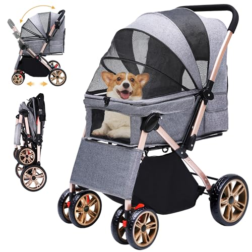 DWVO Hundvagn 3-i-1 hundbur, transportväska, vikbar kattvagn upp till 22 kg, 360° slitstarka EVA-hjul, förvaringskorg, nätfönster, 58,5 x 76 x 105 cm, hundvagn för hundar (grå)