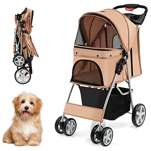COSTWAY Hundvagn husdjur buggy upp till 15 kg, hundvagn med nätfönster och mugghållare & korg och solskydd, vikbar kattvagn, kattvagn för små hundar katter (beige)