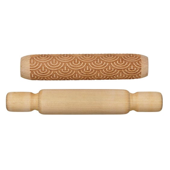 Kavel med mönster för lera, båg-motiv, 1 mönstrad kavel och 1 slät. Tillverkade av trä
