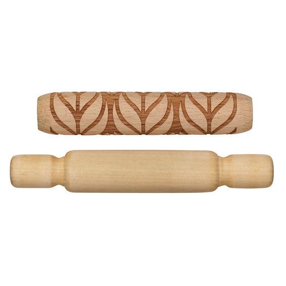 Kavel med mönster för lera, blad-motiv, 1 mönstrad kavel och 1 slät. Tillverkade av trä