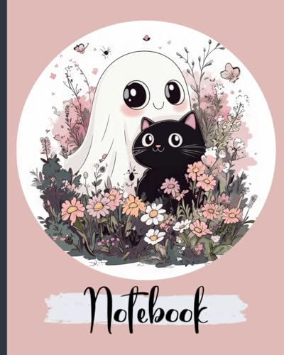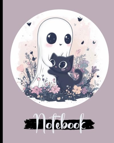 Kawaii Ghost & Cat Notebook: Halloween Themed Cute Wildflower Vintage Garden Pastel - 8"x10" Large & Wide Ruled.