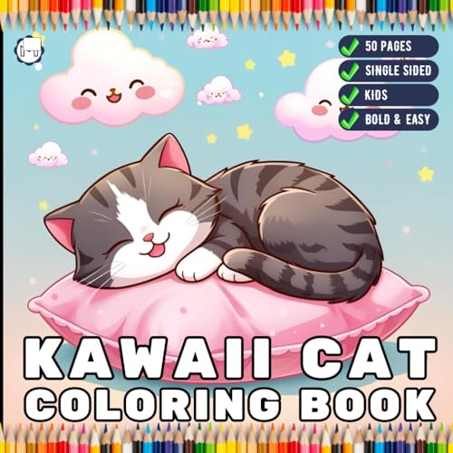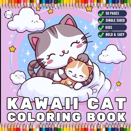 Cute Kawaii Cat Coloring Book for Kids Boys Girls Teens Youth 50 Pages Single Sided Kawaii Kitten Coloring Sheets for Children Stress Relief ... Pages Bold and Easy Simple Cat Coloring Book