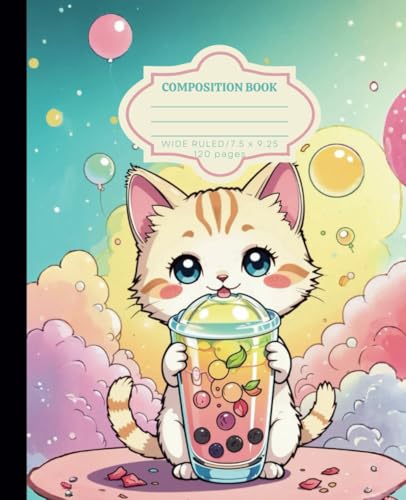 Cute Composition Notebook Wide Ruled: Cute Kawaii Cat Aesthetic, Preppy Journal For Girls: Very Cute Kawaii Style Cat & Boba Tea Notebook! Kitty with ... Writing, Journaling, Workbook For Students