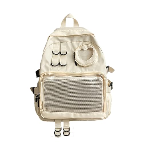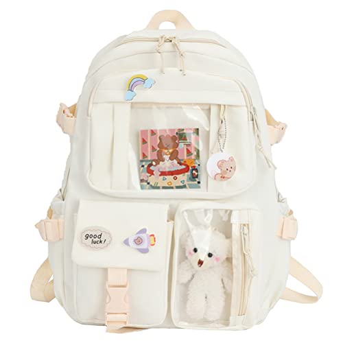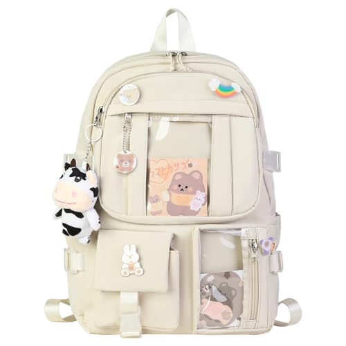 QOCO kawaii-ryggsäck med pins och tillbehör, Harajuku Kawaii Bag Aesthetic-skolryggsäck, söt skolväska för tonårsflickor, 40 x 30 x 11 cm, 01-beige