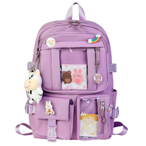 Kawaii-ryggsäck med kawaii-nål och tillbehör, stor kapacitet, söt björn, accessoar, ryggsäck för skola, flera fickor, handväska, japansk skolväska för tonårsflickor, 40 x 30 x 11 cm, 02 – lila