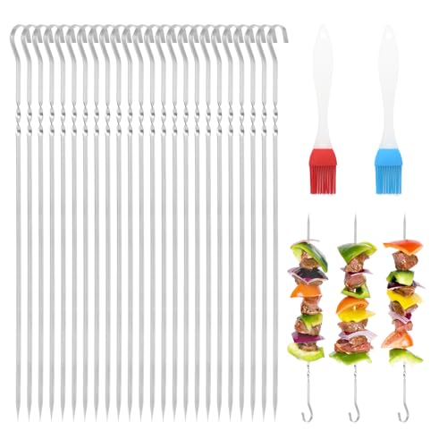 Grillspett i rostfritt stål, 20 stycken grillspett av rostfritt stål + 2 borstar, 30 cm kebabspett återanvändbar grillkabb, grillspett av rostfritt för lägereld eller grillskål