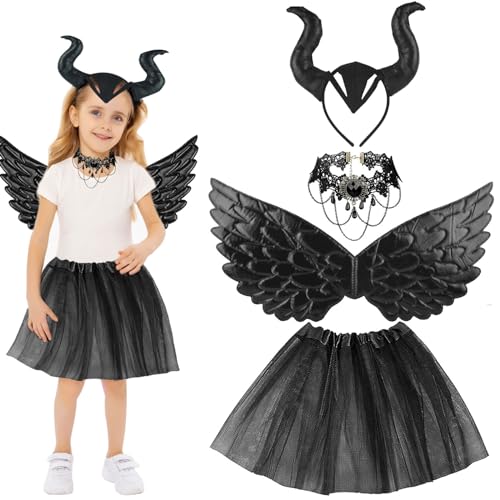 4 stycken djävulsdräkter flickor, drottning horn kostym, halloweenkostymer för flickor, halloweenkostym barn, karnevalkostym med gotisk spets halsband horn huvudbonad vingar kedja häxkostym
