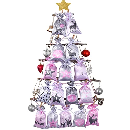 PANSIBY Adventskalender för fyllning, julkalender självpåfyllning hängande med rosa grå tygpåsar, 24 tygpåsar stor (12 x 20 cm) kedja för gör-det-själv pyssel för barn, flickor, kvinnor