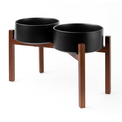 SPUNKYJUNKY Hundskål keramik dubbel hund matskål upphöjd skål med akaciaträstativ för stora hundar (1 800 ml, svart)