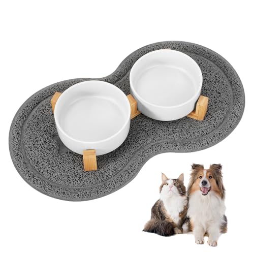 Vexillic Hundskål keramik, 400 ml dubbel matskål hund, hundskål upphöjd med bambustativ och halkfri matta för små till medelstora hundar (vit)