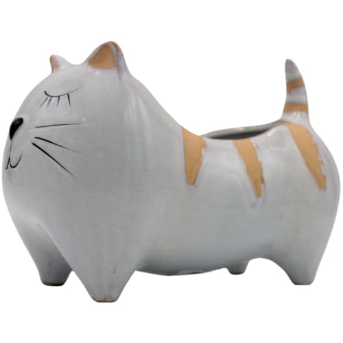 Ytterkruka – blomkruka – planteringskärl – dekorativ skål av keramik, motiv: katt i ljusgrå, mått L/B/H: ca 21 x 12 x 14 cm