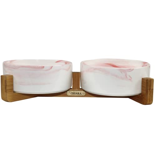 CHIARA MARMA foderskål, dubbel CHNM-130 DB-WH/PI, matskål, dryckesskål, hållbar (storlek: M, halkfri, diskmaskinssäker, material: Keramik, bambustativ), vit/rosa