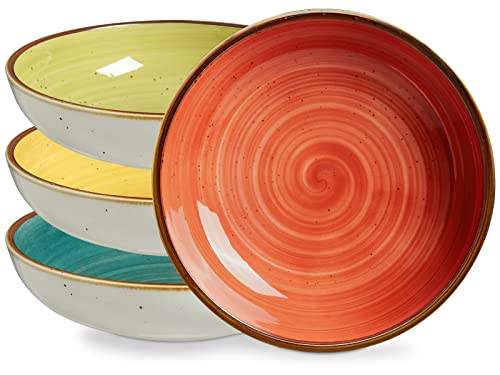 ONEMORE Salladspastaskålar i porslin, 850 ml stora middagstallrikar i keramik och sallad, skålar set, grunda serveringsskålar för soppa, efterrätt och pizza. Mikrovågsugns- och diskmaskinssäkra tallrikar, set med 4, blandade färger