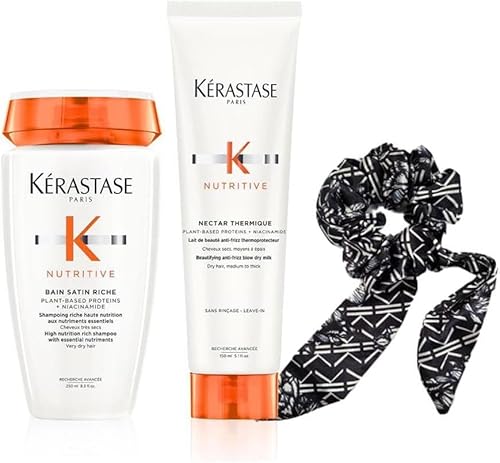 KERASE Nutritive - näringsrik rutin för torrt och tjockt hår - rikt satinbad schampo (250 ml) + termisk nektar (150 ml) + foulchy (scarf scrunchy)