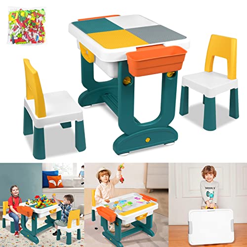 JNGLGO Barnbordsset med 2 stolar, aktivitetsbord för barn med 300 byggklossar, multifunktionella för barn byggklossar bord