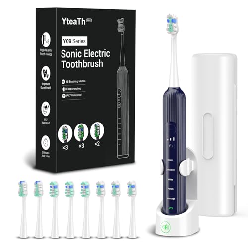 Elektrisk sonisk tandborste för vuxna och barn, 5 rengöringslägen med 3 intensitetsnivåer, timer, 8 reservborsthuvuden och resväska, uppladdningsbar Sonic Toothbrush blå