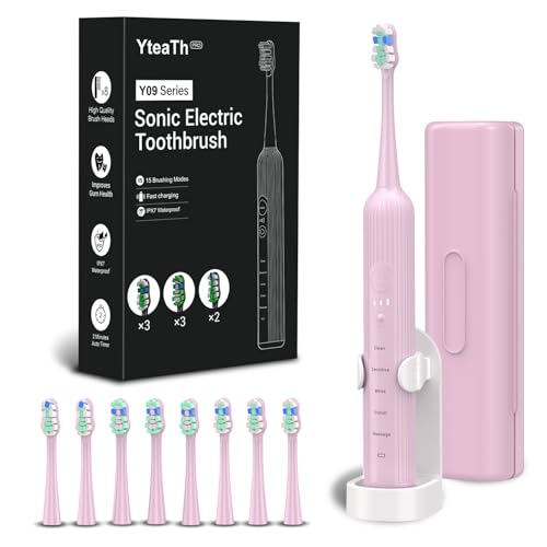 Elektrisk sonisk tandborste för vuxna och barn, 5 rengöringslägen med 3 intensitetsnivåer, timer, 8 reservborsthuvuden och resväska, uppladdningsbar Sonic Toothbrush rosa