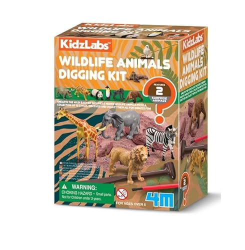 4M 00-03481 KidzLabs Utgrävningssats för vilda djur – 2 realistiska överraskningsfigurer mellan elefanter, tigrar, giraffer och Zeber – pedagogiskt spel om arkeologi och natur för barn