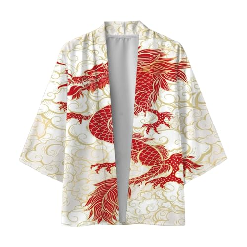 Mifeiwukawa Badrock morgonrock herr japansk kimono rock jacka trekvarts ärmar med lös yin yang och drake tryck unisex lös blus sommar topp, Röd, L
