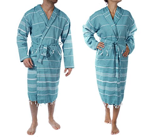 Cacala 100% Turkish Cotton Kimono Design Pestemal Unisex Bathrobe, Luxurious Soft Hooded Bathrobes for Men Women, Quick Dry Extra Absorbent Luxury Plush Long Robe, Aqua Small